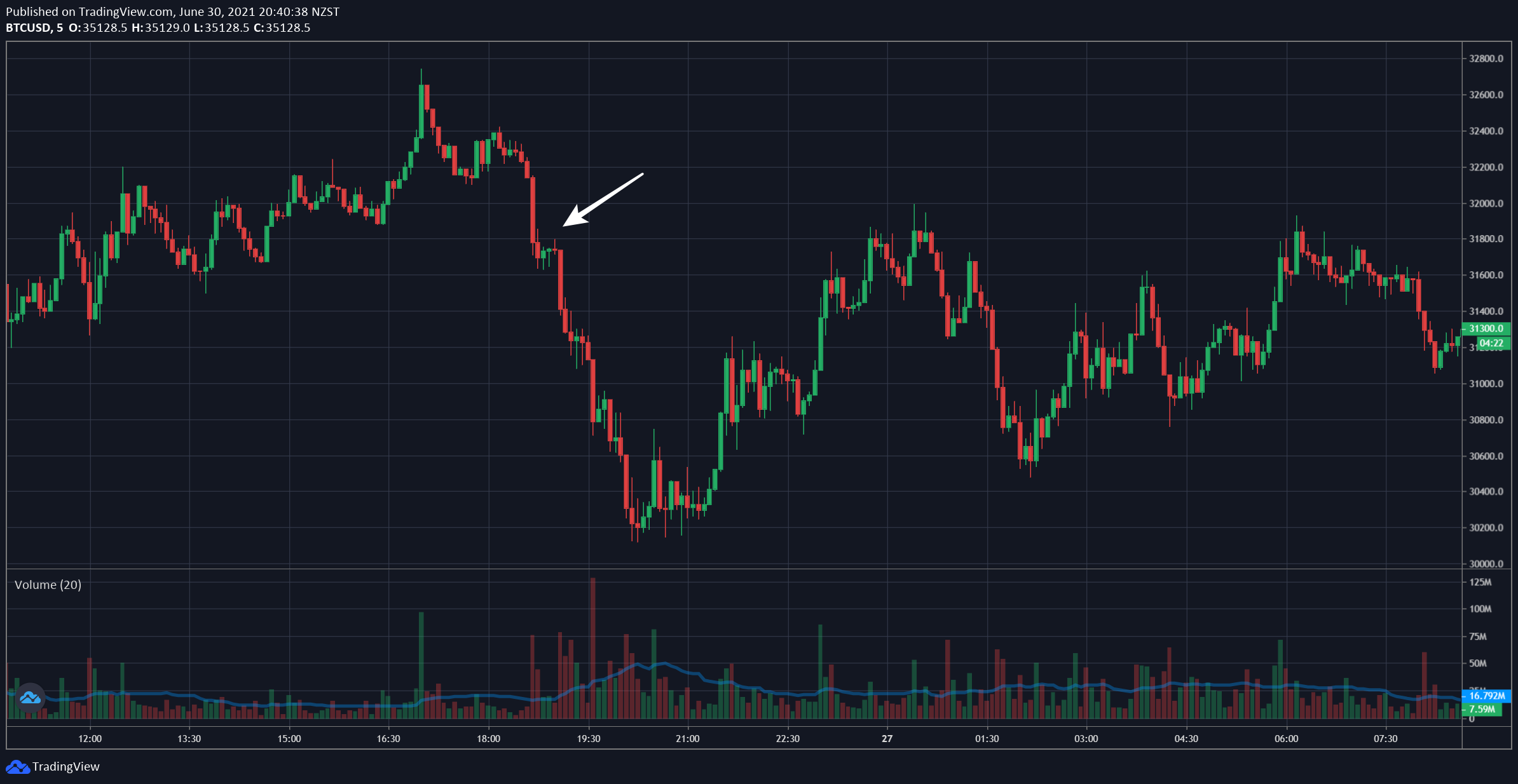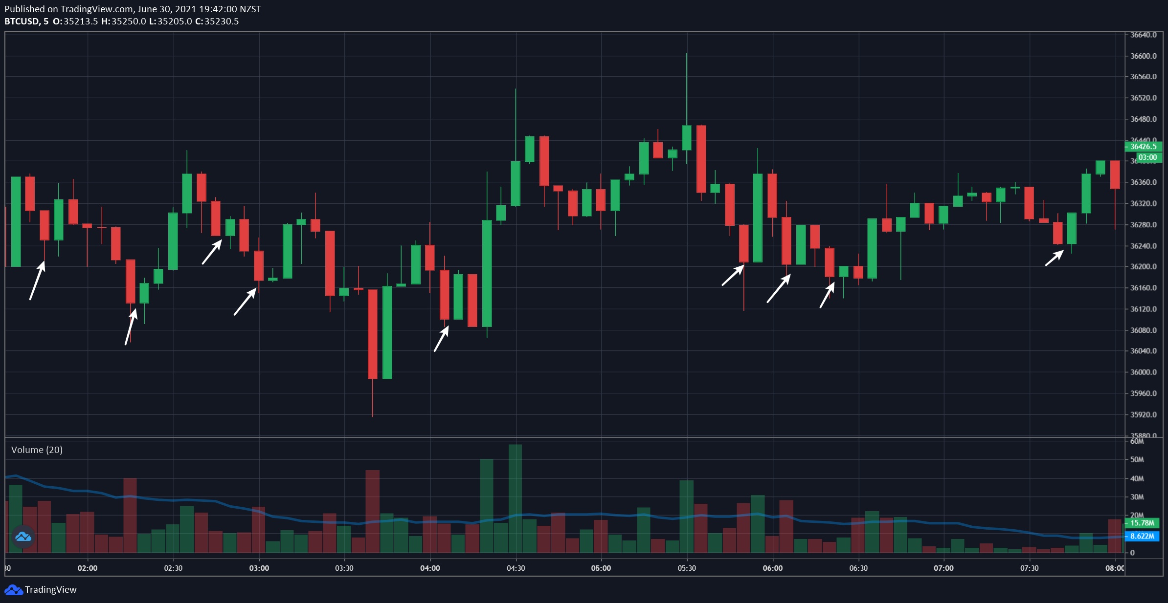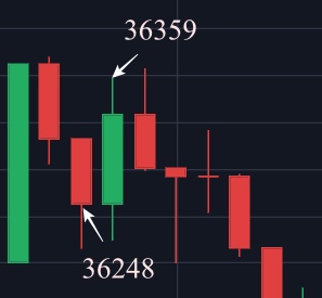 첫 번째 진입 시점을 예로 들어 볼게요. 5분 봉 차트 두 번째 음봉의 종가는 36,248불입니다. 그때 매수를 하고 그와 동시에 40불 위인 36,288불(+0.1%)에 매도주문을 넣으면 두 번째 양봉의 종가가 36,359불이기 때문에 5분이 지나기 전에 주문체결이 무조건 될 겁니다.