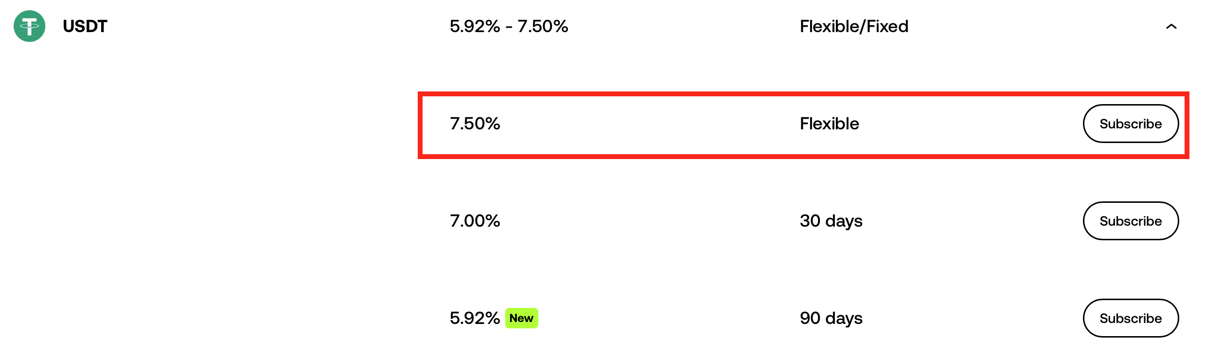 그러면 투자할 수있는 여러 종류의 가상자산들이 보이는데 저는 USDT를 선택하겠습니다. 현재 실시간 연이율이 7.5%입니다. 오른쪽 끝 Subscribe 눌러주시면 됩니다.