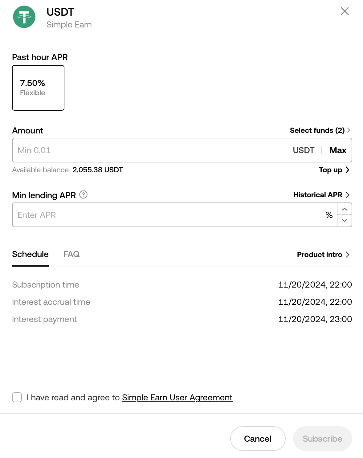 Amount에서 원하시는 투자금액 (최소 $0.01) 적어주시고 Min lending APR은 1% 적어주시면 언제나 투자가 가능하게 세팅됩니다. 그리고 약관에 동의하신 후 Subscribe 눌러주시면 투자가 최종 완료됩니다. 현재 7.5% 연이율로 한 시간 단위로 수익이 발생하며 원금과 수익금은 언제나 지연 없이 출금 가능합니다.