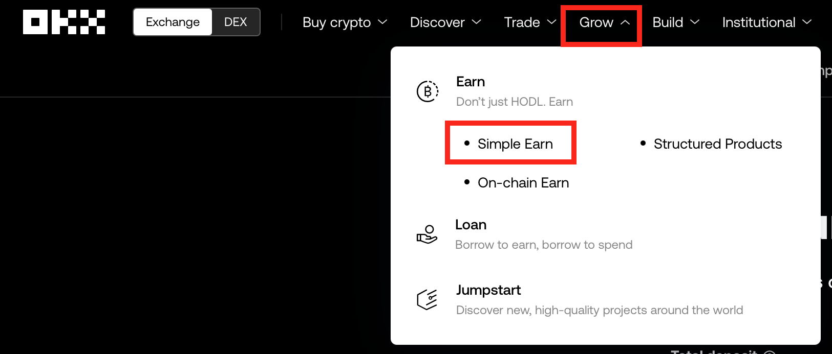 OKX가입하시고 기존 한국 거래소 (업비트, 빗썸 등)에서 이 거래소로 투자할 금액을 보내주시길 바랍니다. 저는 보통 리플(XRP)을 이용해서 보냅니다. 그리고 사진과 같이 왼쪽 상단 메뉴에서 Grow 클릭, Earn에서 Simple Earn클릭합니다.