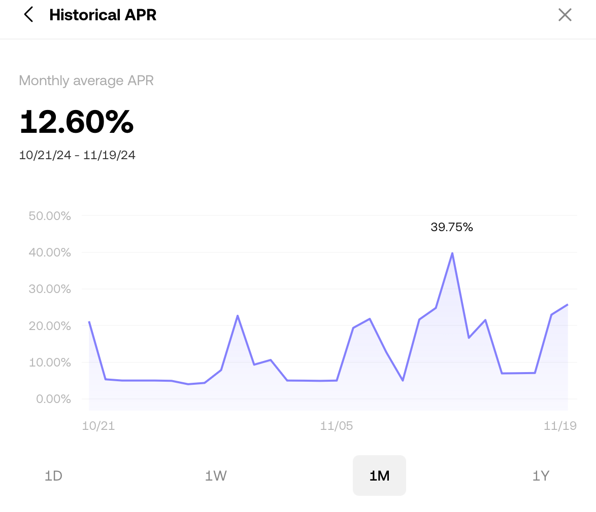 위 표는 지난 한달간 연이율 변화표인데 최고일 때는 39.75%까지 올라갔었습니다. 요즘같이 코인거래에 사람들이 몰릴 때는 이렇게 연이율이 급상승할 때가 많습니다. 그러면 그 연이율에 해당되는 수익을 시간 단위로 받으실 수 있습니다.